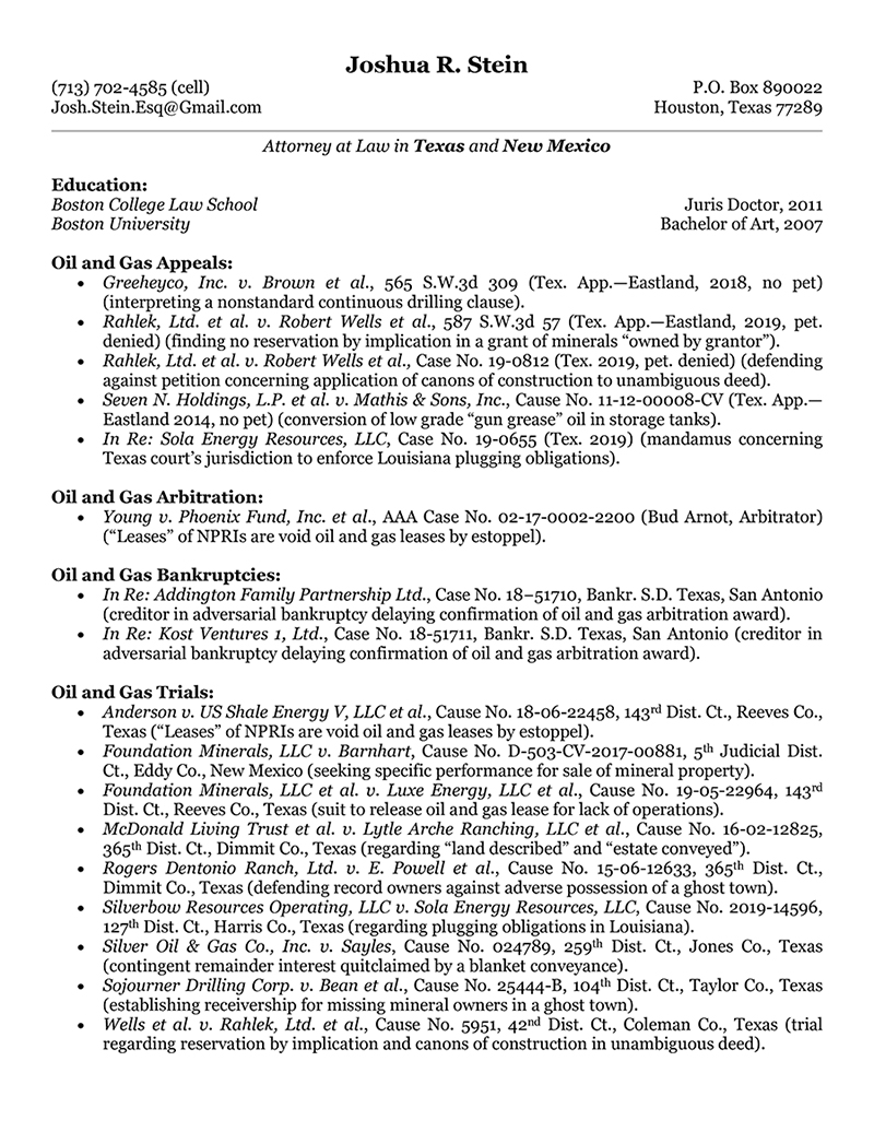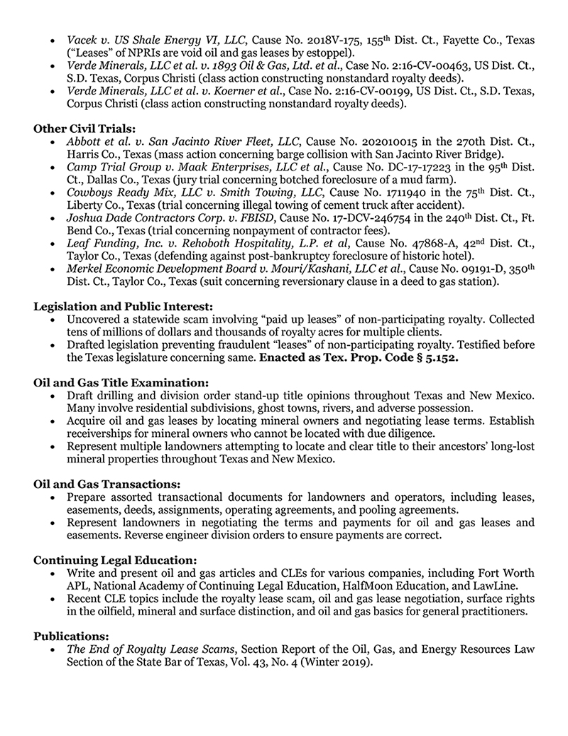 AboutI came to Texas after graduating from Boston College Law School in 2011. At the time, the Massachusetts economy was terrible and "job" was a four letter word on campus-- but oil was near record highs in Texas. I've never looked back. I'm not native to Texas or New Mexico, but I'm proud to say I've been to every county in both states. Although I live in Houston, my cases take me to every corner of Texas and New Mexico. My practice focuses on oil and gas title litigation and examination. Oil and gas attorneys tend to travel because venue is mandatory at the situs of the land. I've written over 100 drilling and division order title opinions. In 2019, I drafted legislation designed to protect royalty owners from a predatory leasing scam. The scam involves offering royalty owners a "bonus" in exchange for signing a "paid up lease" which is secretly intended to be a deed. Governor Abbott signed the legislation and it was enacted into law as Texas Property Code § 5.152. |
